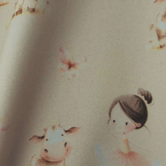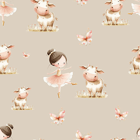 Die kleine Ballerina Leni tanzt fröhlich neben ihrer liebenswerten Kuhfreundin Kuni, umgeben von zarten Schmetterlingen auf einem warmen, beigefarbenen Hintergrund.